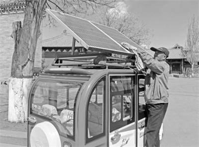今年64岁的吴先生是同馨物业的一位保洁员,目前负责南城墙入口处的保洁工作。他告诉记者,为了出行方便,两年前他购买了一辆电动三轮车。但每次充电特别麻烦,由于电动三轮车的电池重,他需要在家里电源处接一根很长的电线拉到楼门外给车充电,而且每两天就需要充电一次。去年他家搬到了云顶雅园,由于住得楼层高了,充电的麻烦就更大了。遇到问题该咋解决呢?熟悉电方面知识的吴先生通过在网上搜索学习,在去年4月份从网上花了554元购买了一块48伏120瓦的光伏板,按照随光伏板寄来的说明书,吴先生用了不到两天的时间就在车顶安装好了光伏板。然而由于是初次安装以及转化的电能不足等问题,靠光伏板的电能,电动三轮车的电池还是经常处于“吃不饱”的状态。通过总结上次安装经验以及向他人请教,6个多月后,吴先生又花了不到400元的价格购买了一块与上次同样大小的光伏板,并将两块光伏板组装成一个大的光伏板安装在车顶。另外,这块大的光伏板还可自由“活动”,车辆运行时,将光伏板平铺放置在车顶;停放在固定位置时,将光伏板放置成与车顶成35度到45度角的最佳位置,让其充足地吸收太阳光照,为车辆充电。