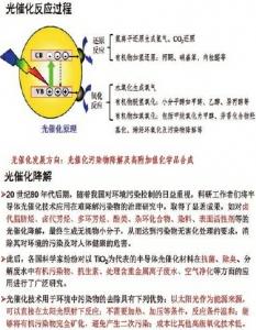 光催化降解就是利用辐射、光催化剂在反应体系中产生的活性极强的自由基,再通过自由基与有机污染物之间的加合、取代、电子转移等过程将污染物全部降解为无机物的过程。发挥性有机物光催化降解过程主要包括传质过程和光催化反应过程。20世纪八十年代后期,随着我国对环境污染控制的日益重视,科研工作者们将半导体光催化技术应用在难降解污染物的治理研究中,取得了显著成果,如对卤代脂肪烃、卤代芳烃、多环芳烃、酚类、杂环化合物、染料、表面活性剂等的光催化降解,最终生成无机物小分子,从而达到污染物无害化处理的要求,消除其对环境的污染及对人体健康的危害。此后,各国科学家纷纷对以二氧化钛为代表的半导体光催化材料在抗菌、除臭、分解废水中有机污染物、抗生素、处理含重金属离子废水、空气净化等方面的应用进行了广泛研究。光催化技术用于环境中污染物的去除具有下列优势:以太阳光作为能源来源,可以直接在太阳光照射下进行反应;不需要加热、加压等条件,反应条件温和;能够将有机污染物完全矿化,避免产生二次污染;成本比其他高级氧化技术低。
