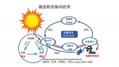 当前,在光催化合成化学品的研发中心,还提出了液态阳光理念,其中以二氧化碳和水的循环作为能量的载体,将二氧化碳进行转化与存储,并运输分配和用户使用,然后再将使用后的二氧化碳循环利用,其中驱动这一循环的驱动力是太阳能,通过光催化、光电催化将太阳能转化为太阳能燃料或者通过太阳能电池将太阳能转化为电能,再进行转化为太阳能燃料。太阳能驱动主要参与了这些红色的过程,其中一个重要的物质是氢气。