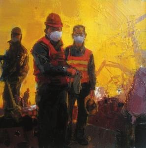 (油画)《拂晓——火神山医院建筑工地》 李藻华作