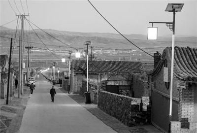 天镇县谷前堡镇白羊口村自从装上太阳能路灯后,每天太阳西沉时路灯就亮起,村民晚上再也不用“摸黑”出门。图为夜幕降临后的白羊口村。 本报记者 张燕伟摄