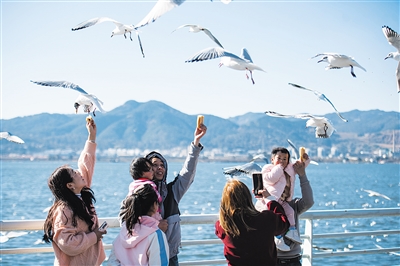 2月11日,游客在昆明海埂大坝给红嘴鸥喂食。