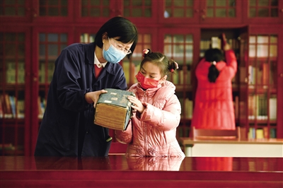 近年来,河北省石家庄市大力加强古籍整理保护和研究开发工作,对石家庄市图书馆馆藏16万册古籍进行梳理、造册、著录、数字化及文创开发,同时面向大众开展“汲古润今”普及推广活动,让更多的读者亲近古籍、领略古籍之美,感受中华传统文化的魅力。2月17日,在河北省石家庄市长安区石家庄市图书馆古籍阅览厅,工作人员正在为一名小读者介绍古籍知识。 新华社发