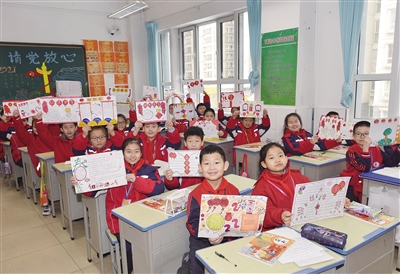 2月17日,平城区45小四年级7班的学生们展示假期里制作的手抄报。 本报记者 戎禹仁摄