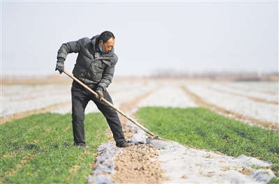 2月23日,在河南省安阳市滑县小铺乡界河路村,由于气温回升,村民揭掉麦田的部分地膜。