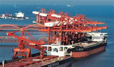 两艘轮船靠泊在唐山港曹妃甸港区矿石码头卸货(7月18日摄,无人机照片)。