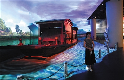 7月27日,游客在嘉兴市南湖旅游区的南湖革命纪念馆内留影。