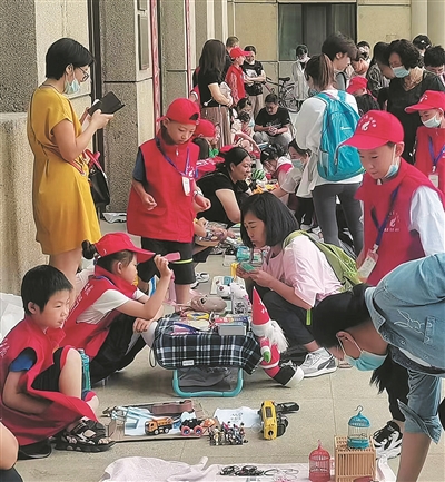 “快来看,商品大甩卖啦!”“娃娃模型买一送一。”“快来拆‘盲盒’,礼品多多。”……活动现场十分热闹,小记者们摆好设计精美的售卖招牌,铺好垫子,把待售的物品摆放整齐,卖力吆喝招揽“顾客”。