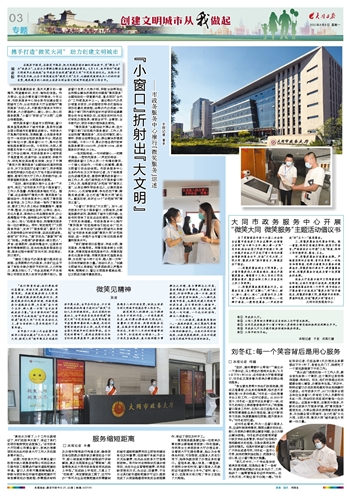 政务大厅是展示我市文明形象的前沿阵地,让我们积极行动起来,把微笑服务渗透到服务的每一个环节,将市政务大厅服务窗口打造成为“微笑大同”的开端起点,用微笑传播文明,展现城市的热情、厚道和包容,打造“微笑大同”新名片!