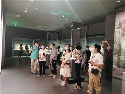 图为国家高级导游朱孟麟(左一)在市博物馆为厦门大学EMBA读书会“领读者计划”之《魏书洛阳城》大同行的专家团队讲解。