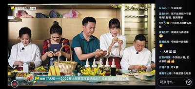◀图为金牌导游张亮(左三)在电影频道参加2022年大同黄花丰收活动月电影频道融媒体直播活动,向嘉宾介绍大同黄花制作技艺。