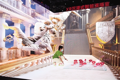 8月30日,工作人员在“新技术 融创新高地”2022中国新媒体技术展上展示XR沉浸式智能演播室。当日,2022中国新媒体大会在湖南长沙开幕,大会主题为“新主流 新征程”。 新华社记者 薛宇舸 摄