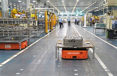 9月20日,南昌经济技术开发区一家企业智能工厂内,智能物流小车在工作。