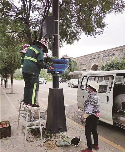 园林工人更换古城内灯杆花盆里的花卉。 杨昱郁摄