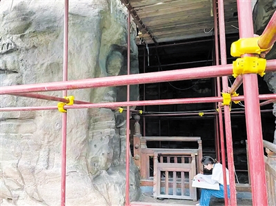 课程第二阶段,开始逐渐进入实践部分。我们开始实地走进洞窟,更加细致地观察、绘制石窟的外立面、平面、窟顶等,并做了相关的文字记录。铅笔削了无数遍,橡皮磨了一层又一层,从最初在脚手架上颤颤巍巍地爬上爬下,到最后驾轻就熟如履平地,洞窟的外立面图、平面图、内壁展开图、窟顶图,一一在我们笔下呈现出来。大到整个崖面的洞窟分布、窟龛之间的关系,小到每一条裂缝、每一处衣褶的表现,都需要细致认真的观察和辨别。作为从未做过石窟寺相关工作的新人,我在绘图过程中也遇到了很多问题,譬如如何在有限的画纸上表现更多更重要的信息?如何将龛窟之间的各种关系表现在图纸上?佛衣上的翻领如何表现?自己所绘的图,最大问题就是比例没有掌握好,导致很多信息无法传达出来。针对这些问题,杭侃院长、彭明浩老师亲自在洞窟为我们一一解答,拿起铅笔、尺子和线坠,借助一盏灯光,教我们一笔笔勾勒,解决了一个又一个的难题。