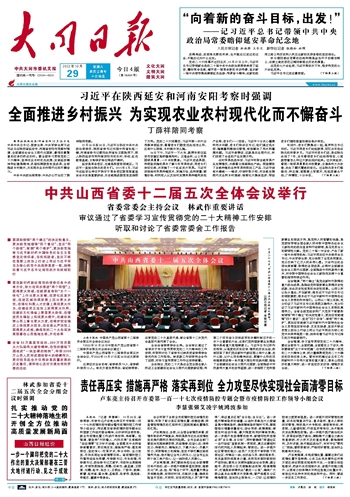 新华社陕西延安/河南安阳10月28日电 中共中央总书记、国家主席、中央军委主席习近平近日在陕西省延安市、河南省安阳市考察时强调,全面建设社会主义现代化国家,最艰巨最繁重的任务仍然在农村。要全面学习贯彻党的二十大精神,坚持农业农村优先发展,发扬延安精神和红旗渠精神,巩固拓展脱贫攻坚成果,全面推进乡村振兴,为实现农业农村现代化而不懈奋斗。