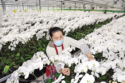 近日,山东省平度市旧店镇花卉种植基地50万株蝴蝶兰进入盛花期,花工们忙碌着整理打包花卉,供应节日市场。
