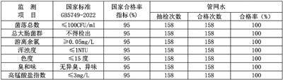 1. 15个采样点97项指标监测结果: 出厂水水质合格率100%;管网水水质合格率100%。