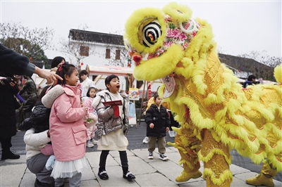 游客在浙江湖州吴兴区八里店镇潞村观看舞狮表演(2月5日摄)。
