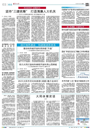 “大同盆地是山西省地热赋存较好的五个盆地之一,浅层、中深层地热资源都很丰富。特别是在天镇探获了我国中东部地区第一口温度高、流量大的深部地热井,经过这几年的勘探,又打了4口井,每一口井都有新的突破。下一步,将做好发电、康养、农业、养殖业等方面的梯级开发利用。”在山西地质集团支持和助力大同地热能产业发展方面,江荣表示,目前在云州区、新荣区、大同经开区及浑源县都有正在进行的施工勘察项目,集团将在摸清地热资源家底、科学合理规划、完善技术支撑、精准开发利用的基础上,因地制宜推动地热资源高效开发利用。此外,还将进一步加强人才队伍建设,加大技术引进力度,助力大同在地热资源利用道路上不断取得新的更大的成绩。