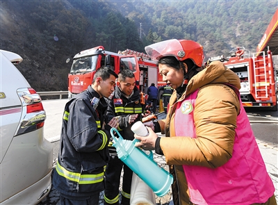 3月18日,在四川省甘孜藏族自治州雅江县,彭三妹(右)为参加救援的消防员送热水。