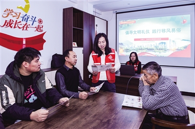 为倡导勤俭节约、文明健康的生活方式,近日,平城区水泊寺街道积极开展移风易俗宣传活动。活动中,街道和社区工作人员深入各社区,通过PPT、海报、发放宣传资料等方式,引导居民坚决抵制不良习俗,以实际行动推动移风易俗、破旧立新。图为工作人员正在通过宣传单页介绍移风易俗。