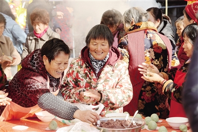 12月16日,在德清县莫干山镇后坞村,村民围在一起做圆子。
