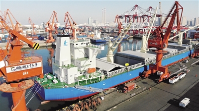 12月16日,“GREEN NAGOYA”轮在青岛港大港码头进行装船作业(无人机照片)。该轮在完成工程车辆、设备、钢材等货物装船后,预计20天后抵达位于坦桑尼亚的达累斯萨拉姆港。