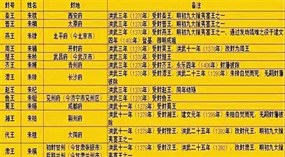明洪武封王简表