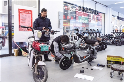 图为销售人员正为顾客调试新购的电动自行车。 本报记者 韩堃摄
