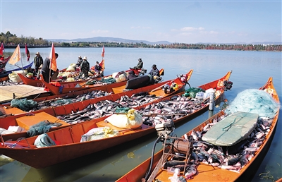 12月25日,云南·江川第十七届开渔系列活动暨高原湖泊水产品交易会在云南省玉溪市江川区星云湖南岸开幕。本届开渔节举办捕鱼比赛、文艺演出、渔人家宴、休闲垂钓等系列活动。活动将持续到2025年1月13日。图为在玉溪市江川区星云湖望海码头,捕鱼回来的渔船在等待称重。 新华社发(梁志强摄)