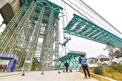 1月14日,工人在为吊装贵州六安高速公路花江峡谷大桥最后一个节段钢桁梁做准备。