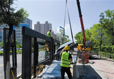 图为公交站亭安装现场。本报记者 戎禹仁摄