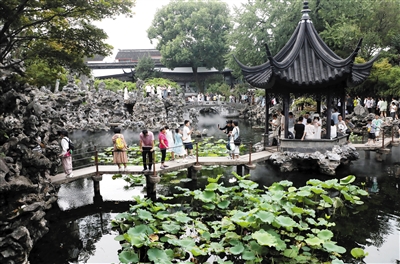 八月十一日,游客在江苏苏州狮子林游玩。进入暑期以来,各地迎来旅游高峰。 新华社发(杭兴微摄)