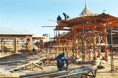 大同古城北城墙外码头服务中心总占地面积2268.9平方米,共有12座建筑,建成后将用于文化展示和游客服务综合管理。图为12月1日,古建工人正在圆形亭廊作业。 本报记者 孙海钧摄
