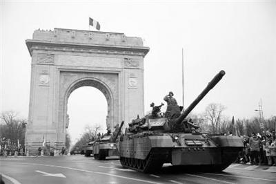 12月1日,在罗马尼亚首都布加勒斯特,参加阅兵的坦克方阵经过凯旋门。当日是罗马尼亚国庆节,罗马尼亚3000多名军人、警察等参加了在布加勒斯特举行的阅兵式。 新华社发