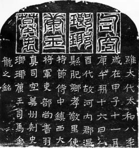 《司马金龙墓表》,1965年出土于大同市御河东石家寨村。与墓表一起出土的有墓铭、漆画、石器等四百多件珍贵文物。墓表为北魏孝文帝太和八年(484年)书刻,为顶圆底方碑形,通高六十四厘米,宽四十六厘米。碑额八个篆书大字“司空琅琊康王墓表”。墓表碑文是: