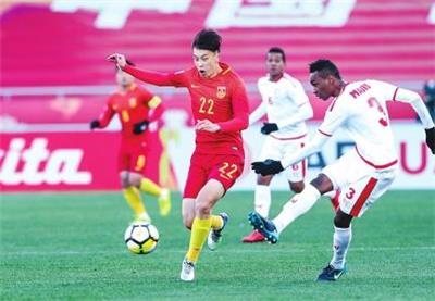 1月9日,在江苏省常州市举行的亚足 联 U23锦标赛A组第一场比赛中,中国队以3比0战胜阿曼队。图为中国队球员巴顿(前左)在比赛中。新华社发