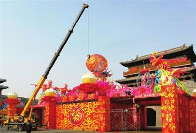 1月26日,记者在南城墙关城内见到,本届灯会体量最大、制作最复杂的灯组《龙凤呈祥》正在进行吊装。据了解,该灯组长35米、高15米,在设计上取“龙凤呈祥”这一吉祥喜庆、高雅美善之意,同时结合大同悠久的佛教文化元素,为市民和游客献上最美好的新春祝福。本报记者陈旭东摄