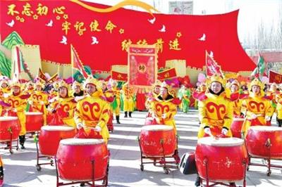 2月22日是农历大年初七,在同煤集团办公楼广场,来自基层单位的街头文艺表演队伍扭秧歌、敲锣鼓,载歌载舞闹新春,为节日的矿山增添了喜庆、祥和的氛围。图为员工家属正在兴高采烈地表演节目。潘少峰摄