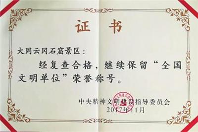 珍惜荣誉,不忘使命,保持初心,奋力前行。近日,云冈旅游区管理委员会接到中央文明委通知:云冈石窟景区顺利通过“全国文明单位”复查验收,继续保留“全国文明单位”荣誉称号。这是自获得“全国文明单位”以来,首次迎接复查并通过验收。