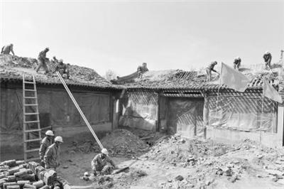 3月26日,来自市鼎城古建工程队的工人们正在对广灵县壶泉镇涧西村3号古民居进行保护性维修。随着气温的不断回升,在广灵县壶泉镇涧西村乡村提升工程施工现场,各支施工队已陆续进场,整个工程现场施工正酣。据悉,2018年,该县将143个行政村按照“示范村、重点村、一般村”分类组织实施乡村提升工程。其中,依托保存较好的明清独特的古民居,将涧西村打造成全市“风貌特色凸显、宜居宜游宜业、生活富裕安康”的特色旅游示范村。 本报记者 李冬宾 通讯员 王春喜摄
