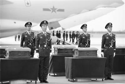 3月28日,在沈阳桃仙机场,礼兵将殓放烈士遗骸的棺椁从专机上护送至棺椁摆放区。当日,第五批在韩中国人民志愿军烈士遗骸由我空军专机护送从韩国接回辽宁沈阳,20位志愿军烈士英灵回到祖国和人民怀抱。 新华社发