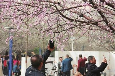 足赏花、拍照,尽享春韵之美。本报记者孙海钧摄随着天气转暖,公园、道路绿化带、古城墙周边桃花悄然绽放,市民驻