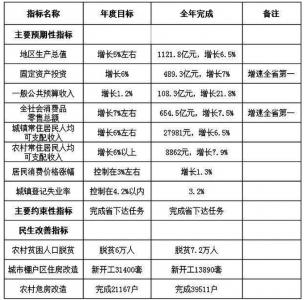 主要预期性指标:地区生产总值增长7%左右;第三产业增加值增长7.5%;规上工业增加值增长6.5%左右;固定资产投资增长10%;全社会消费品零售总额增长7%左右;公共财政预算收入增长7%左右;城乡常住居民可支配收入分别增长6.5%左右和7%;对外贸易进出口总额增长5%;居民消费价格指数控制在3%左右。城镇登记失业率控制在4.2%以内。