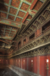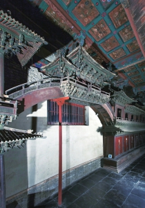 为了通风和光照,殿后壁当心间开有明窗,致使两边的壁藏断开,聪明的古代工匠们充分地运用了力学的原理在其间搭建了一座圆弧形拱桥,并在桥上建有“天宫楼阁”五间,将经橱和佛龛结合为一体,在保留其使用性的同时,更增显其美观,烘托出了“天宫楼阁”的凌空高悬气势。对于这组罕见的辽代小木作,我国著名的建筑学家梁思成先生看后惊叹不已,赞誉其为“海内之孤品,仅此一例”。