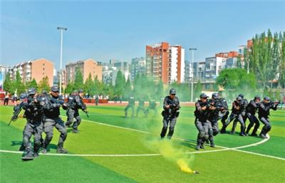 6月1日上午,市公安局和市教育局在市第二高级职业中学联合举办了2018“平安校园行”联合反恐演练活动,民警们言传身教,将安全教育融入具体场景之中,为学生们上了一堂生动的安全教育课。图为巡特警支队特战大队为师生们做持枪战术动作展示。 本报记者 于宏摄