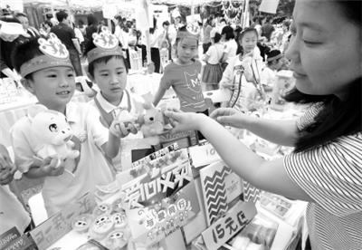 6月2日,上海市虹口区第四中心小学的学生向游客介绍义卖的物品。当日,主题为“一样的童年”爱心义卖活动在上海举行,6000多个家庭在上海市区的多个活动现场参与其中。据悉,此次义卖活动的全部收入将用于帮助云南贫困山区少数民族孩子。 新华社发