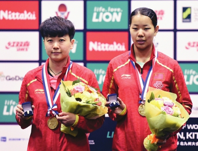 6月10日,在日本北九州市举行的国际乒联巡回赛日本公开赛女双决赛中,因对手刘诗雯/王曼昱组合退赛,中国选手顾玉婷/木子获得冠军。在当日进行的女单决赛中,日本选手伊藤美诚以4比2战胜中国选手王曼昱,获得冠军。在男双决赛中,韩国选手李尚洙/郑荣植以3比1战胜中国选手梁靖崑/周恺,获得冠军。图为顾玉婷(右)/木子在颁奖仪式上。 新华社发