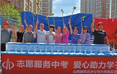 在北岳中学考点外,有家长手持向日葵在场外等待考生,寓意“一举夺魁”,成为考点外一景。一家建筑工程企业项目部的志愿者现场购买了多枝向日葵,免费赠送给陪护家长,大家纷纷手持向日葵合影留念,为考生送上祝福。 尚丽